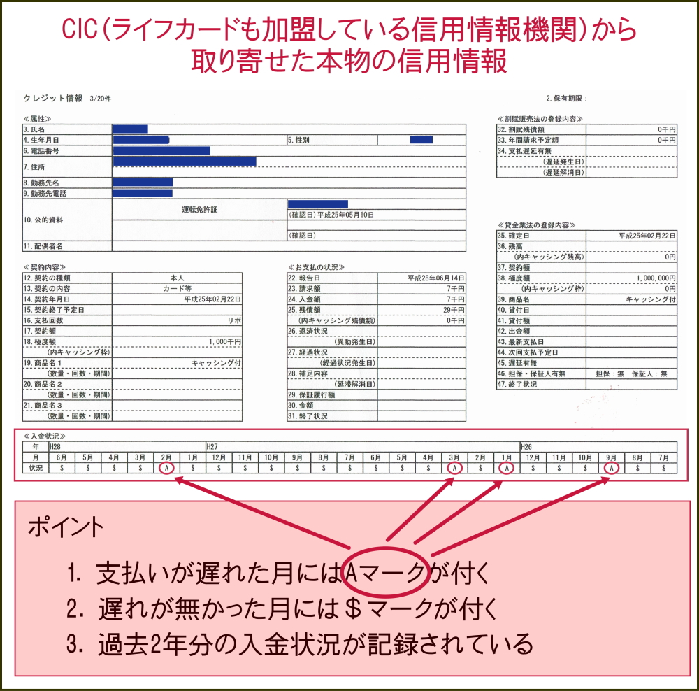これはライフカードも加盟している信用情報機関「CIC(株式会社シー・アイ・シー)」から取り寄せた本物の信用情報の書類です。