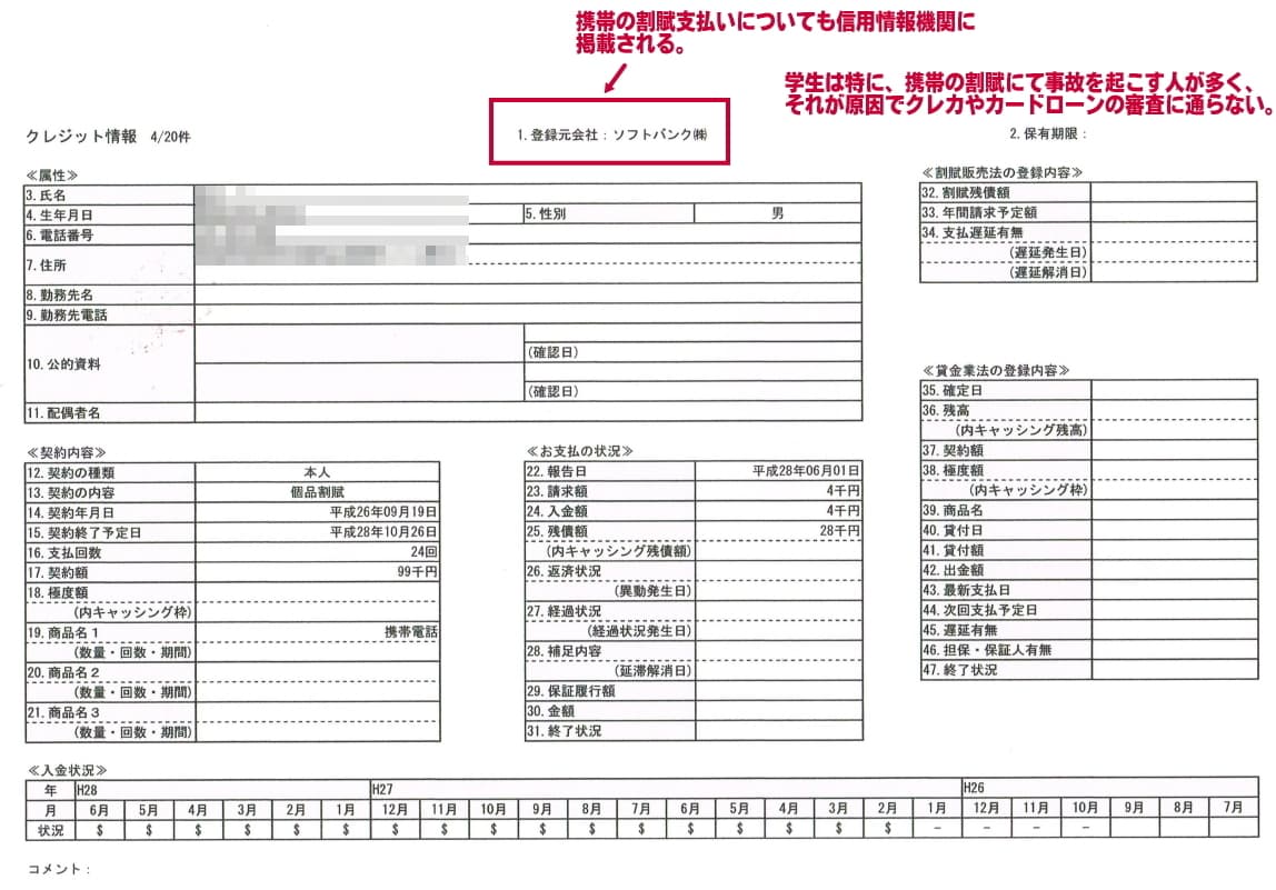 特に学生の場合は、スマホの割賦購入で延滞事故を起こしている人が多いから、そこは要注意ね。